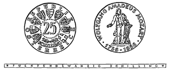 Die Münzen sind aus einer Legierung von 800 Tausendteilen Silber und 200 Tausendteilen Kupfer hergestellt; sie haben einen Durchmesser von 30 mm und ein Rauhgewicht von 13 g, enthalten somit 10'4 g Feinsilber. Abweichungen hievon dürfen im Feingehalt fünf Tausendstel und im Gewicht zehn Tausendstel nicht übersteigen. Die eine Seite zeigt den Tondichter Wolfgang Amadeus Mozart in Vorderansicht bei einem Notenpult stehend, ferner am Rand kreisförmig angeordnet die Umschrift „Wolfgang Amadeus Mozart“ und die Jahreszahl „1756“ und „1956“. Die andere Seite trägt in der Mitte die Ziffer „25“, darunter einen Lorbeerzweig und das Wort „Schilling“, umgeben von den Wappen der neun Bundesländer und der Umschrift „Republik Österreich“. Die innere Einfassung besteht auf beiden Seiten aus einem flachen Stäbchen. Der Rand der Münze ist glatt und trägt die vertiefte Inschrift „Fünfundzwanzig Schilling“.