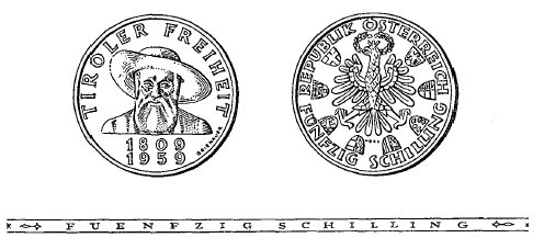 Die Münzen sind aus einer Legierung von 900 Tausendteilen Silber und 100 Tausendteilen Kupfer hergestellt; sie haben einen Durchmesser von 34 mm und ein Rauhgewicht von 20 g, enthalten somit 18 g Feinsilber. Abweichungen hievon dürfen im Feingehalt 5/1000 und im Gewicht 10/1000 nicht übersteigen. Die eine Seite trägt in der Mitte den Tiroler Adler, umgeben von den Wappen der anderen Bundesländer und der Inschrift „Republik Österreich“ und „Fünfzig Schilling“. Die andere Seite zeigt ein Brustbild Andreas Hofers, halbkreisförmig umgeben von der Inschrift „Tiroler Freiheit“; darunter befinden sich die Jahreszahlen „1809“ und „1959“. Die innere Einfassung besteht auf beiden Seiten aus einem flachen Stäbchen. Der Rand der Münze ist glatt und trägt die vertiefte Inschrift „Fuenfzig Schilling“.