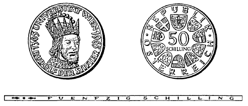 Die eine Seite der Münze hat das Kopfbild des Gründers der Universität Wien nach einem zeitgenössischen Porträt, halbkreisförmig umgeben von den Umschriften „Universität Wien“ und „Rudolf der Stifter“, sowie die Jahreszahlen „1365“ und „1965“ zu zeigen. Die andere Seite hat in der Mitte die Zahl „50“, darunter das Wort „Schilling“, ferner in kreisförmiger Reihung das Bundeswappen und die Wappen der neun Bundesländer sowie die Umschrift „Republik Österreich“ zu zeigen. Beide Seiten sind mit einer erhöhten Randleiste zu umrahmen. Der Rand der Münze ist glatt zu gestalten und hat die vertiefte Inschrift „Fuenfzig Schilling“ zu tragen.