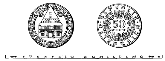 (2) Die andere Seite hat in der Mitte die Zahl „50“, darunter das Wort „Schilling“, ferner in kreisförmiger Reihung das Bundeswappen und die Wappen der neun Bundesländer sowie die Umschrift „Republik Österreich“ zu zeigen. Beide Seiten sind mit einer erhöhten Randleiste zu umrahmen. Der Rand der Münze ist glatt zu gestalten und hat die vertiefte Inschrift „Fuenfzig Schilling“ zu tragen.