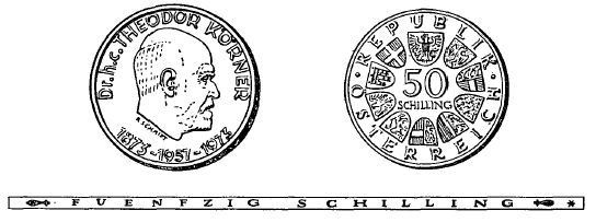 (1) Die eine Seite der Münze hat das Kopfbild des verstorbenen Bundespräsidenten Dr. h. c. Theodor Körner, umgeben von der Umschrift „Dr. h. c. Theodor Körner“ und die Jahreszahlen „1873-1957-1973“ zu zeigen.