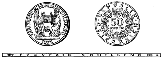 (1) Die eine Seite der Münze hat die Bischöfe Rupert und Virgil, den Dom und das Landeswappen von Salzburg, umgeben von der Umschrift „1200 Jahre Dom zu Salzburg 1974“ zu zeigen.