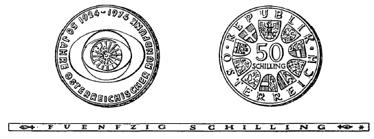 (2) Die andere Seite hat in der Mitte die Zahl „50“, darunter das Wort „Schilling“, ferner in kreisförmiger Reihung das Bundeswappen und die Wappen der neun Bundesländer sowie die Umschrift „Republik Österreich“ zu zeigen. Beide Seiten sind mit einer erhöhten Randleiste zu umrahmen. Der Rand der Münze ist glatt zu gestalten und hat die vertiefte Inschrift „Fuenfzig Schilling“ zu tragen.