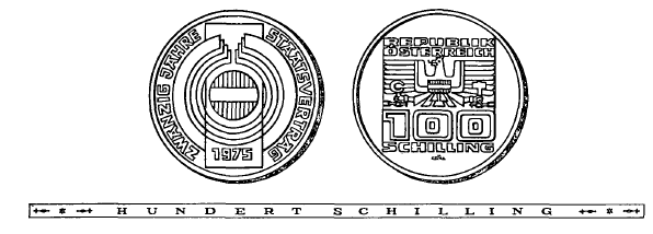 (1) Die eine Seite hat vier Ringe zu zeigen, die von einem Rechteck, auf dem der runde Bindenschild und die Jahreszahl 1975 angebracht sind, durchdrungen werden. Diese Darstellung soll die Wiedergewinnung der Freiheit Österreichs durch den Abschluß des Staatsvertrages mit den vier Signatarstaaten symbolisieren.
