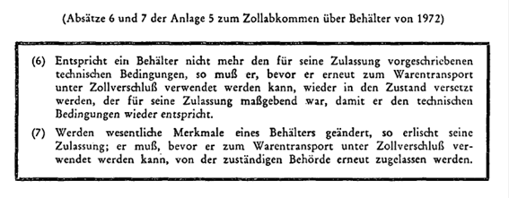 (7) Werden wesentliche Merkmale eines Behälters geändert, so erlischt seine Zulassung; er muß, bevor er zum Warentransport unter Zollverschluß verwendet werden kann, von der zuständigen Behörde erneut zugelassen werden.