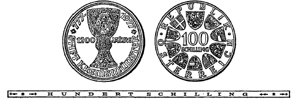 (1) Die eine Seite hat den Tassilokelch und die Inschrift „777-1977“ sowie „1200 Jahre Stift Kremsmünster“ zu tragen.