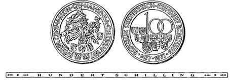 (2) Die andere Seite hat die Zahl „100“, das Bundeswappen und die Wappen der neun Bundesländer in dreizeiliger Anordnung sowie als Umschrift die Worte „Republik Österreich“, „Hundert Schilling“ und die Jahreszahlen „1477-1977“ zu tragen.