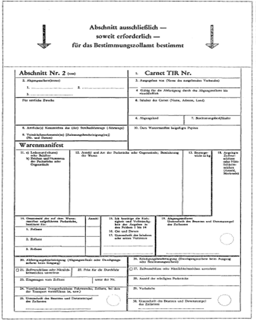 - 6. Zahl der Abschnitte: Wird der Transport nur über ein Abgangszollamt und ein Bestimmungszollamt durchgeführt, so muß das Carnet TIR mindestens zwei Abschnitte für das Abgangsland, zwei Abschnitte für das Bestimmungsland und zwei Abschnitte für jedes Durchgangsland enthalten, Für jedes zusätzliche Abgangszollamt (oder Bestimmungszollamt) sind zwei weitere Abschnitte erforderlich.