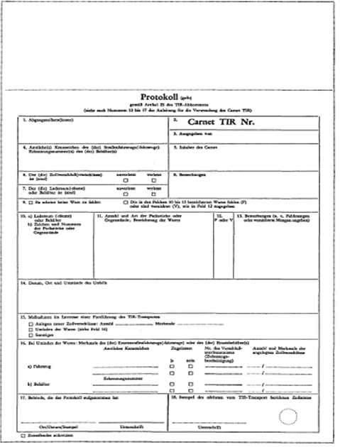 - 16. Das Protokoll bleibt bis zur Bestimmungszollstelle dem Carnet TIR beigefügt.