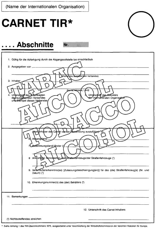 - 3. Für die Beförderung von Tabakwaren und Alkohol, für die vom bürgenden Verband nach Anlage 6, Erläuterung 0.8.3 eine erhöhte Sicherheitsleistung verlangt werden kann, fordern die Zollbehörden Carnets TIR mit gut lesbarem Aufdruck „TOBACCO/ALCOHOL“ und „TABAC/ALCOOL“ auf dem Umschlagblatt und allen weiteren Blättern. Zusätzlich sind auf einem gesonderten Blatt, das nach Seite 2 des Carnet-TIR-Umschlagblatts einzufügen ist, zu den Tabak- und Branntweinerzeugnissen, für die die Sicherheit geleistet wurde, nähere Angaben – zumindest in englischer und französischer Sprache – zu machen.