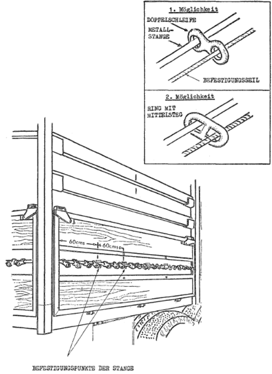 Ein Zwischenraum von mehr als 200 mm, der jedoch 300 mm nicht übersteigen darf, kann zugelassen werden, wenn die Ringe beidseitig von den Pfosten vertieft an den Seitenwänden angebracht sind und wenn die Ösen oval und gerade groß genug sind, um über die Ringe gestreift werden zu können.