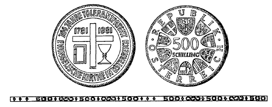 (1) Die eine Seite hat in der Mitte ein Kreuz zu tragen. Die dadurch gebildeten Felder haben links oben die Jahreszahl „1781“ und rechts oben die Jahreszahl „1981“ sowie links unten eine Bibel und rechts unten einen Kelch zu zeigen. Die Umschrift hat zu lauten: „200 JAHRE TOLERANZPATENT EVANGELISCHE KIRCHE IN ÖSTERREICH“.