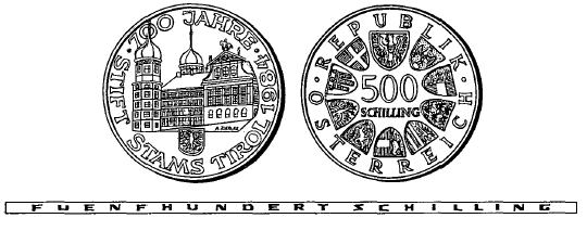 (2) Die andere Seite hat in der Mitte die Zahl „500“, darunter das Wort „SCHILLING“, ferner in kreisförmiger Reihung das Bundeswappen und die Wappen der neun Bundesländer sowie die Umschrift „REPUBLIK ÖSTERREICH“ zu tragen.