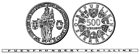 (2) Die andere Seite hat in der Mitte die Zahl „500“, darunter das Wort „SCHILLING“, ferner in kreisförmiger Reihung das Bundeswappen und die Wappen der neun Bundesländer sowie die Umschrift „REPUBLIK ÖSTERREICH“ zu tragen.