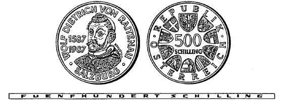 (1) Die eine Seite hat das Kopfbild des Erzbischofs, die Inschrift „WOLF DIETRICH VON RAITENAU“ und „SALZBURG“ sowie die Jahreszahlen „1587“ und „1987“ zu zeigen.