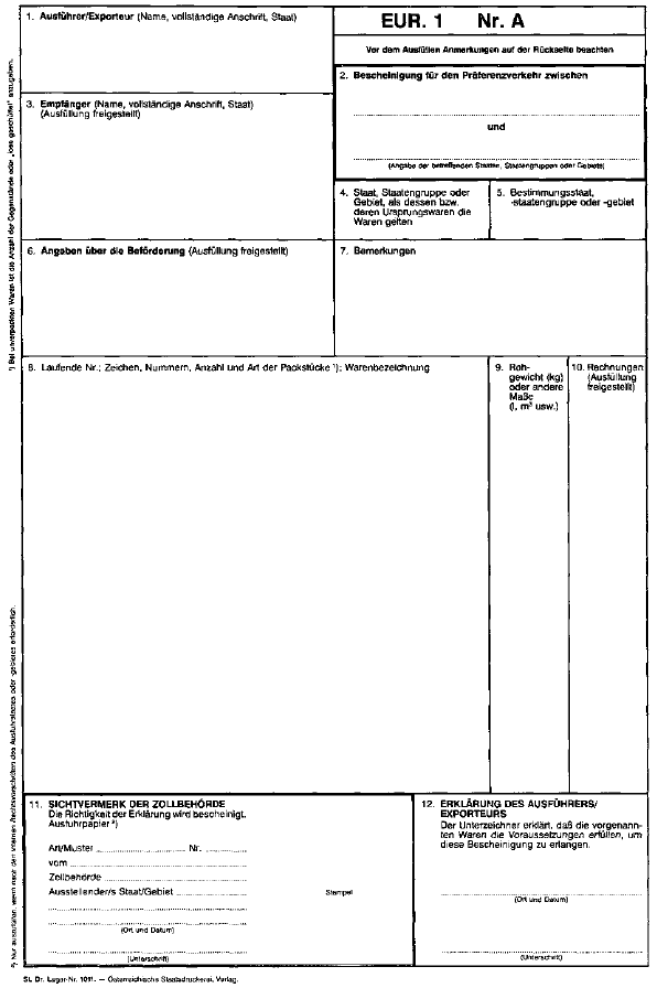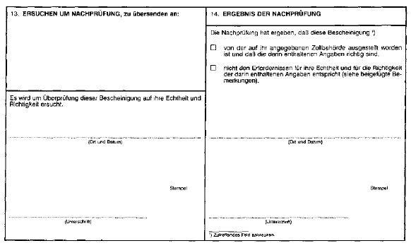 - 2. Zwischen den in der Warenverkehrsbescheinigung angeführten Warenposten dürfen keine Zwischenräume bestehen, jeder Warenposten muß mit einer laufenden Nummer versehen sein. Unmittelbar unter dem letzten Warenposten ist ein waagrechter Schlußstrich zu ziehen. Leerfelder sind durch Streichungen unbrauchbar zu machen.
