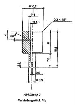 Das Anschlußstück P1 (siehe Abbildung 1) wird aus Duraluminium oder aus Messing angefertigt. Es ist so beschaffen, daß es mittels eines Anschlußstücks aus Polyäthylen an die unterschiedlichen Ventilsysteme paßt (siehe Abbildungen 2 und 3). Die Aufnahmeflasche (siehe Abbildung 4) besteht aus weißem Glas, das außen mit einer durchsichtigen Kunststoffschutzschicht überzogen ist. Der Flascheninhalt beträgt 50 bis 100 ml. Die Flasche ist mit dem Ventil, aber ohne Steigrohr ausgestattet.