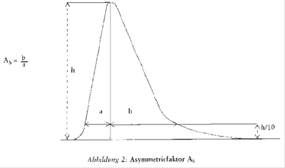 - Peakasymmetrie: Der Asymmetriefaktor AS soll zwischen 0,9 und 1,5 liegen (zur Definition des Asymmetriefaktors siehe Abbildung 2). Bei der Aufzeichnung des Chromatogramms zur Bestimmung der Peakasymmetrie sollte der Papiervorschub mindestens 2 cm/min betragen.