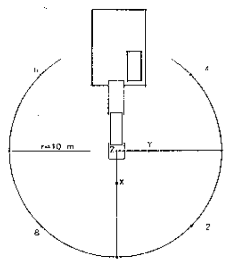 Befindet sich das Hubwerk auf der Höhe des Auslegers, so ist die Messfläche eine Kugel mit einem Radius von 4 m, deren Mittelpunkt mit dem geometrischen Mittelpunkt des Hubwerks zusammenfällt.