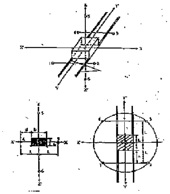 L = halber Abstand zwischen zwei aufeinander folgenden Mikrophonpositionen; l = Länge des Hubwerks (entlang der Achse des Auslegers); b = Breite des Hubwerks; h = Höhe des Hubwerks; d = Abstand zwischen Mikrophonträger und dem Hubwerk in Richtung Ausleger.