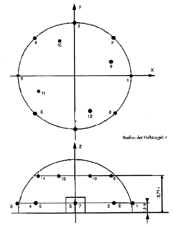 Zusätzlich zu den in den Abschnitten 7.2.1 und 7.2.2 der Norm EN ISO 3744:1995 beschriebenen Messflächen kann eine halbkugelförmige Messfläche mit 12 Mikrophonen verwendet werden. Die kartesischen Koordinaten der 12 Mikrophonpositionen auf der halbkugelförmigen Fläche mit dem Radius r sind der nachstehenden Tabelle zu entnehmen. Der Radius r der Halbkugel muss größer/gleich dem Doppelten der größten Abmessung des Bezugsquaders sein. Der Bezugsquader ist definiert als der kleinstmögliche Quader, der die Geräte und Maschinen (ohne Anbauteile) gerade einschließt und an der schallreflektierenden Fläche endet. Der Radius der Halbkugel ist auf den nächsthöheren der folgenden Werte zu runden: 4, 10, 16 m.