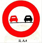 1. d) das Zeichen (Signal) „ÜBERHOLEN VERBOTEN“ (II, A.4); dieses Zeichen (Signal) wird verwendet, um anzuzeigen, daß zusätzlich zu den allgemeinen Überholvorschriften das Überholen von mechanisch angetriebenen Straßenfahrzeugen (einschließlich Obussen) mit Ausnahme von Motorrädern ohne Beiwagen verboten ist; bei Linksverkehr sind die Farben der abgebildeten Wagen vertauscht.