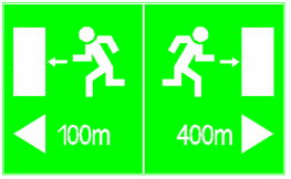 - –Fluchtwege durch folgende Fluchtwegorientierungskennzeichen in Abständen von höchstens 25 m an den Tunnelwänden in 1,0 m Höhe (Unterkante) über dem Fluchtweg und unter Angabe der Entfernung der beiden jeweils nächstgelegenen Notausgänge: