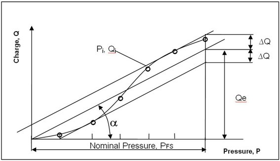 (1) Die Berechnung des Toleranzbandes oder der linearen Regression hat gemäß nachstehender Grafik zu erfolgen, welche die zur Berechnung der spezifischen Parameter der piezoelektrischen Druckaufnehmer verwendeten Begriffe und Definitionen zeigt: