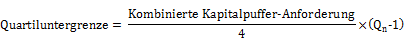 1. a) Liegt das von dem Unternehmen vorgehaltene und nicht zur Unterlegung etwaiger Anforderungen gemäß Art. 92a der Verordnung (EU) Nr. 575/2013 und gemäß §§ 102 und 103 verwendete harte Kernkapital, ausgedrückt als Prozentsatz des gemäß Art. 92 Abs. 3 der genannten Verordnung berechneten Gesamtrisikobetrags, innerhalb des untersten Quartils der kombinierten Kapitalpuffer-Anforderung, so ist der Faktor 0.