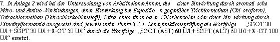 5. In Anlage 2 entfällt bei der Untersuchung von Arbeitnehmer/innen, die einer Einwirkung durch Toluol oder Xylole ausgesetzt sind, unter Punkt 2.3. der Satz „Diese Untersuchungen sind spätestens ab 1.7.1997 durchzuführen.“.
