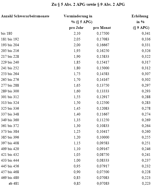 (2) Bei einem Pensionsantritt vor dem Monatsersten nach der Erreichung des Regelpensionsalters (§§ 4 Abs. 1 und 16 Abs. 5) vermindert sich der nach Abs. 1 ermittelte Wert um 0,35 % für jeden Monat des früheren Pensionsantrittes. Handelt es sich jedoch um eine Schwerarbeitspension (§ 4 Abs. 3), so beträgt die Verminderung 0,175 % für jeden Monat des früheren Pensionsantrittes, wobei sich dieser Wert für je zwölf Schwerarbeitsmonate, die über 180 Schwerarbeitsmonate hinausgehen, entsprechend der Anlage 1 zu diesem Bundesgesetz um den zwölften Teil von 0,05 Prozentpunkten vermindert, und zwar bis zur Erreichung von 480 Schwerarbeitsmonaten. Fällt der Zeitpunkt der Erreichung des Regelpensionsalters selbst auf einen Monatsersten, so gilt dieser Tag als Monatserster im Sinne des ersten Satzes.