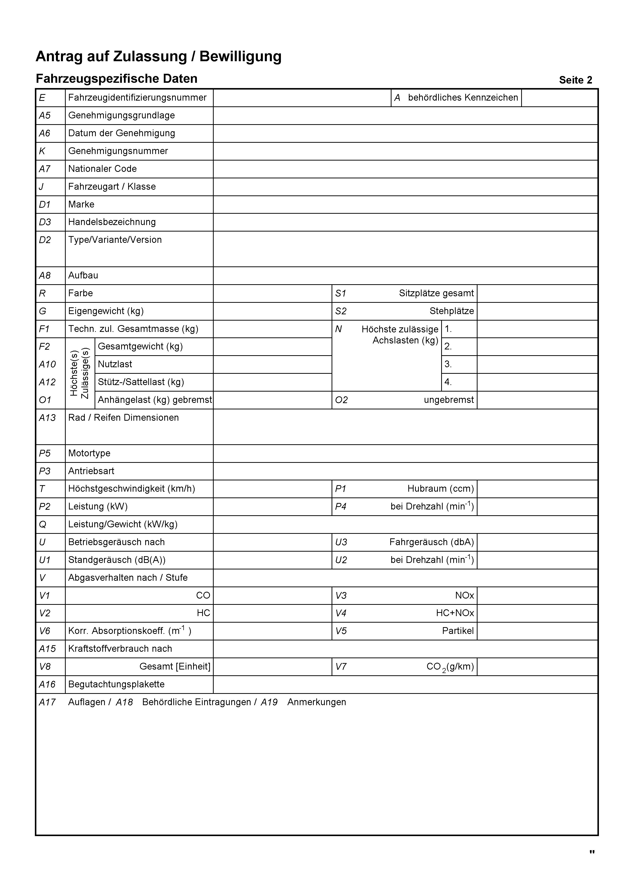 „§ 12. (1) Anträge auf Zulassung, auf vorübergehende Zulassung oder auf Erteilung von Bewilligungen zur Durchführung von Überstellungsfahrten von Kraftfahrzeugen oder Anhängern oder Anträge auf Ausgabe von Kennzeichentafeln für eingeschränkte Zulassung oder für Probefahrten sind bei den Zulassungsstellen mit einem Formblatt nach dem Muster der Anlage 3 einzubringen. Der Antragsteller hat durch Unterschrift die Richtigkeit der Angaben des Formblattes zu bestätigen.