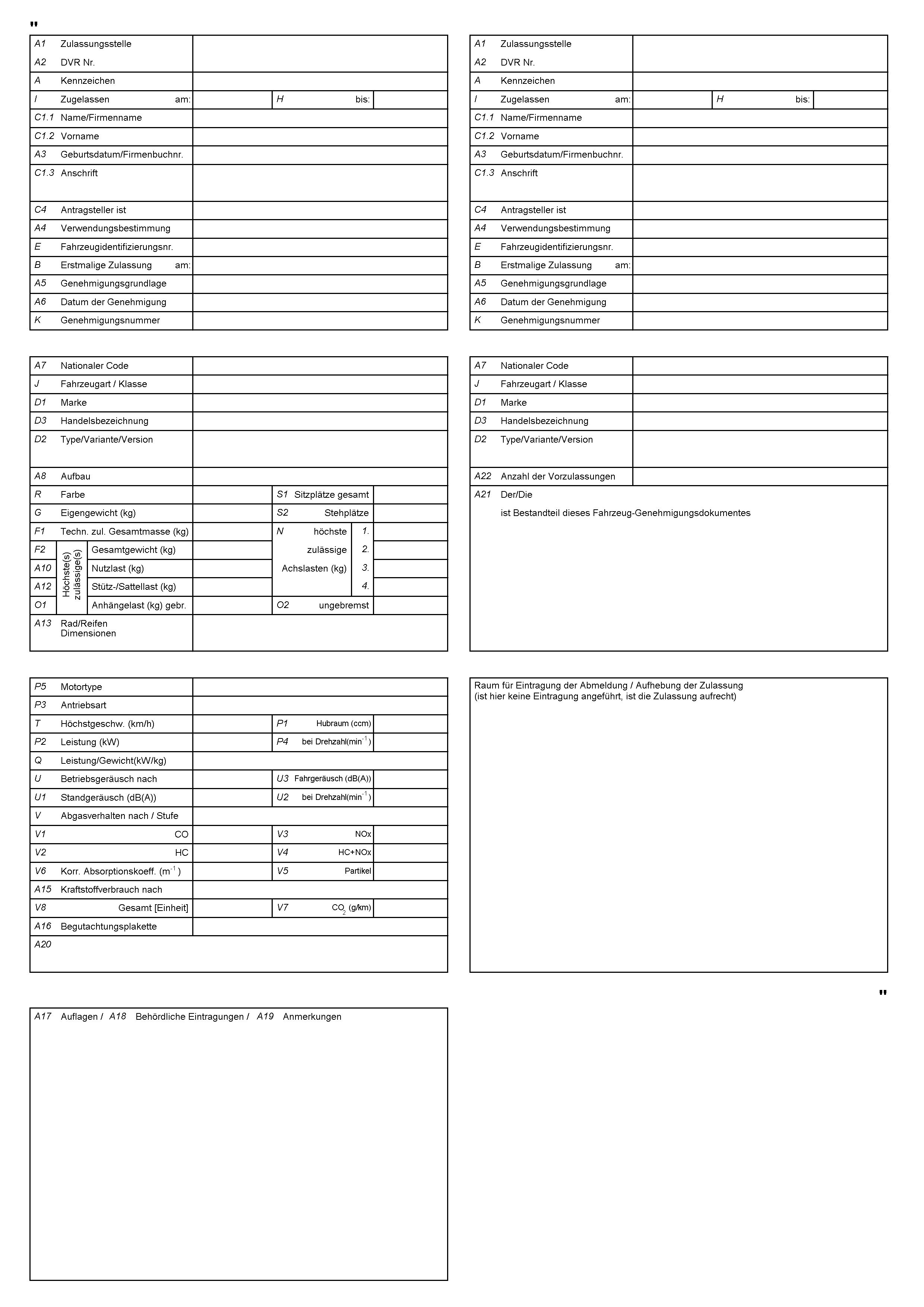 „(4) Zulassungsbescheinigungen weisen eine fortlaufende Nummer auf. Der Name der Behörde ist durch die Zulassungsstelle auf der Vorderseite der Zulassungsbescheinigung mittels Stampiglie aufzubringen. Im Feld A 1 der Zulassungsbescheinigung kann entweder der Name der Versicherung oder die Zulassungsstellennummer angegeben sein. Wird gemäß § 33 Abs. 3 oder 3a KFG 1967 eine neue Zulassungsbescheinigung durch den Landeshauptmann ausgestellt, so ist auf der Vorderseite anstelle des Namens der zuständigen Behörde der jeweilige Amtsstempel des Landeshauptmannes anzubringen. Im Feld A 1 ist in diesem Fall anstelle der Zulassungsstelle einzutragen, dass die Ausstellung vom Landeshauptmann für die jeweils zuständige Zulassungsbehörde erfolgt ist. Die Zulassungsstelle hat über verdruckte, beschädigte oder sonst unbrauchbar gewordene Zulassungsbescheinigungsformulare genaue Aufzeichnungen (Eintragung in eine Liste) zu führen. Im Falle der Ausstellung eines Duplikates kann auch nur ein Duplikat des jeweils verlorenen Teiles 1 oder 2 der Zulassungsbescheinigung ausgestellt werden.