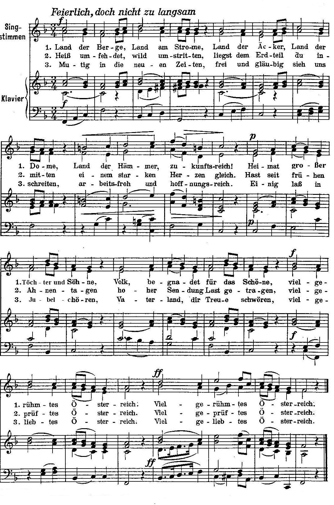§ 1. Die Bundeshymne der Republik Österreich besteht aus drei Strophen des Gedichts „Land der Berge“ und der Melodie des sogenannten Bundesliedes, beides in der Form der einen Bestandteil dieses Gesetzes bildenden Anlage.