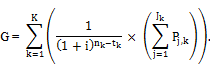 § 4. (1) Der Garantiebetrag G zum Bilanzstichtag, zu dem die zusätzliche Rückstellung zu bilden ist, wird jeweils aus der abgezinsten Summe der bisherigen Prämieneinzahlungen ermittelt, wobei Jk die Anzahl der bisherigen Prämieneinzahlungen von Vertrag k und K die Gesamtanzahl der Verträge der prämienbegünstigten Zukunftsvorsorge angeben: