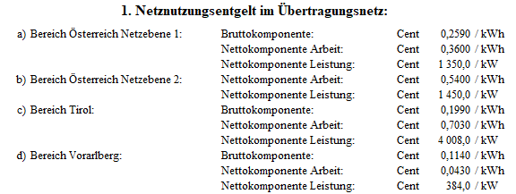 - a) Für sämtliche Einspeiser (unabhängig von Netzebene und Netzbereich) 0,304 Cent/kWh;