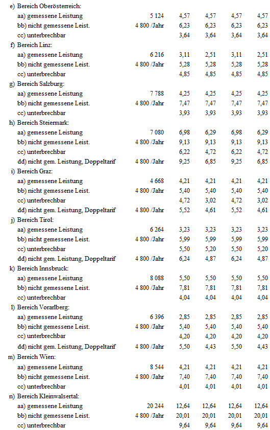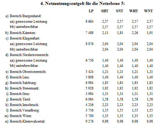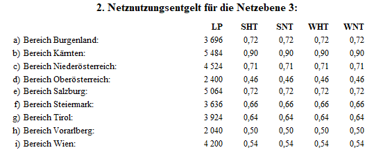 „(2) Für die Netznutzung der Netzebene 3 der Austrian Power Grid AG sind folgende Jahresbeträge (in tausend Euro – TEUR) in zwölf gleichen Teilbeträgen monatlich zu leisten, wobei alle Rechnungen am 15. des dem Leistungserbringungsmonat folgenden Monats fällig sind: