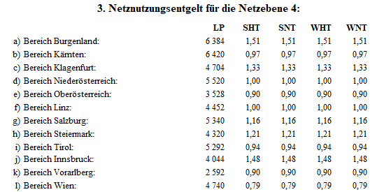 „(2) Für die Netznutzung der Netzebene 3 der Austrian Power Grid AG sind folgende Jahresbeträge (in tausend Euro – TEUR) in zwölf gleichen Teilbeträgen monatlich zu leisten, wobei alle Rechnungen am 15. des dem Leistungserbringungsmonat folgenden Monats fällig sind: