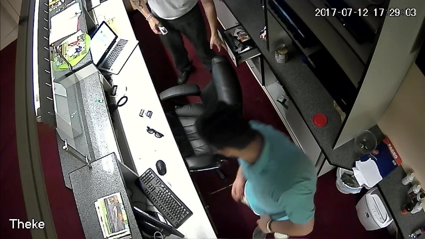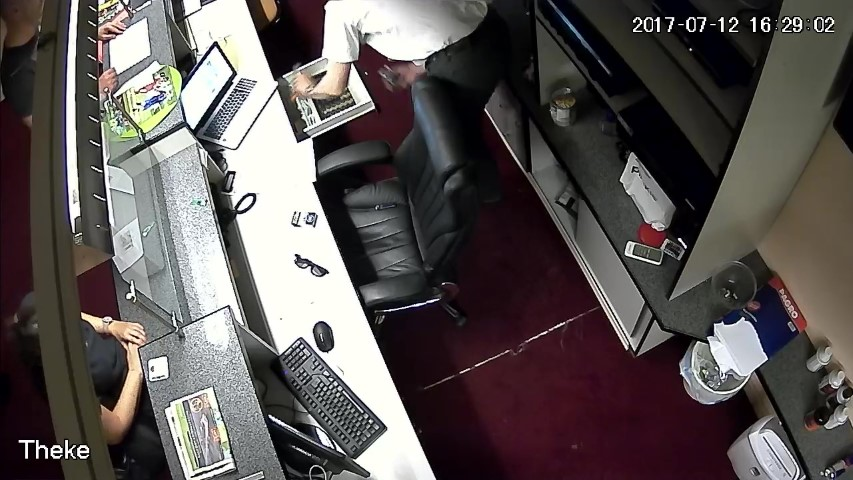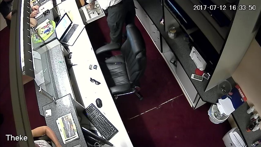 F.12. 16:28:01 Uhr: Finanzpolizist weist D an, die Geldlade des Tresens zu öffnen.