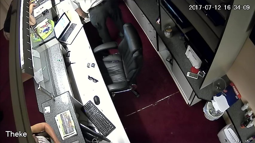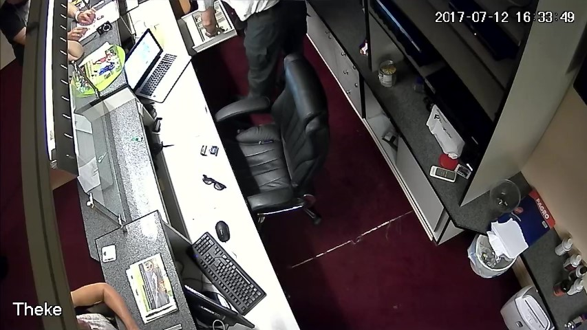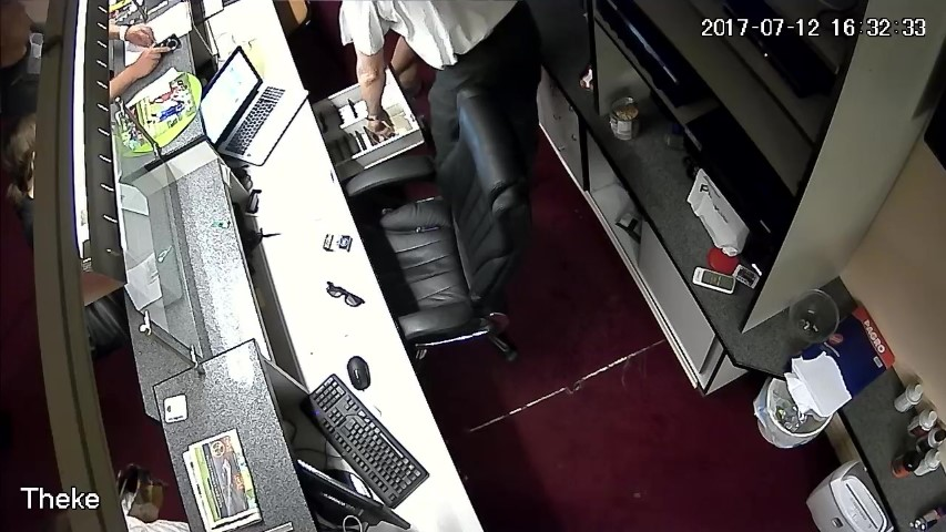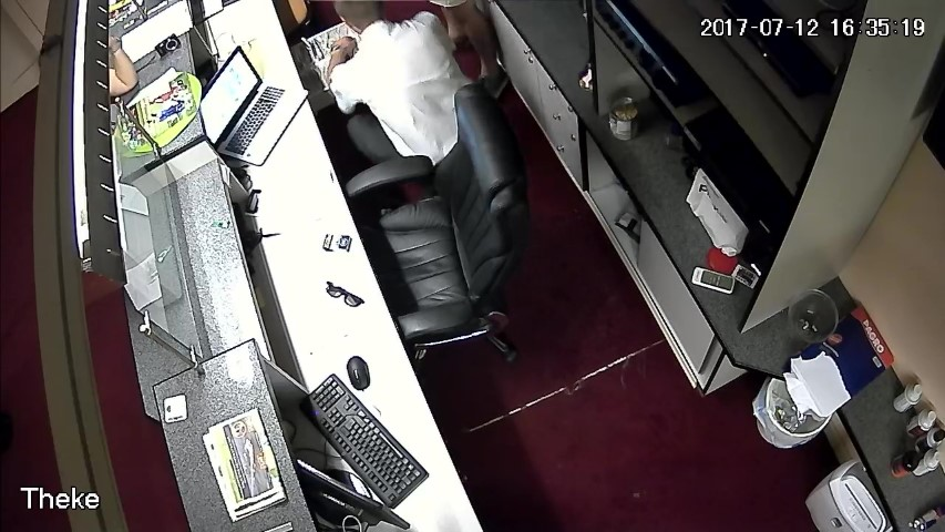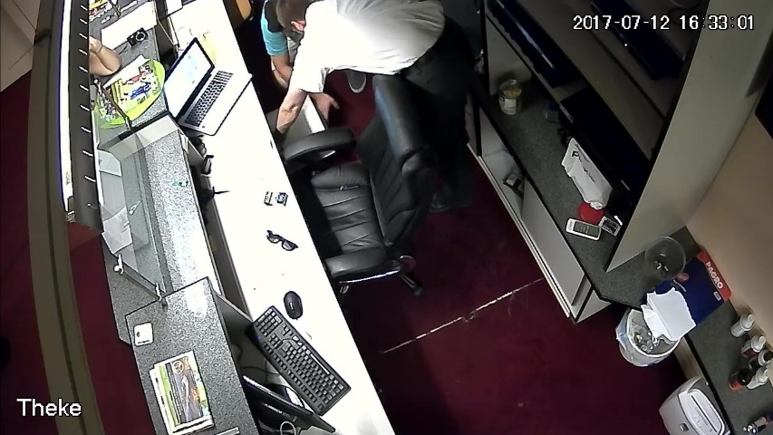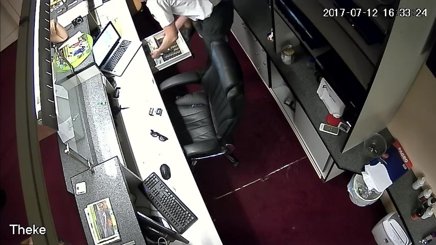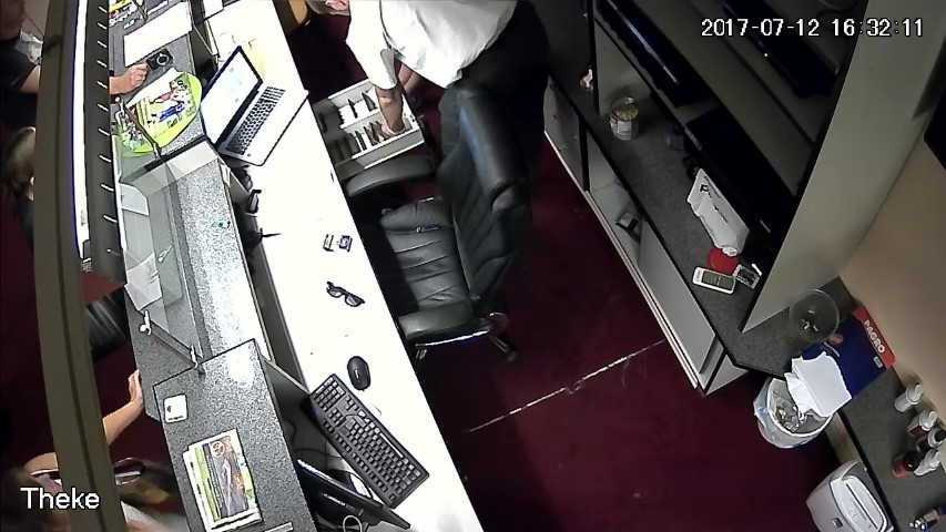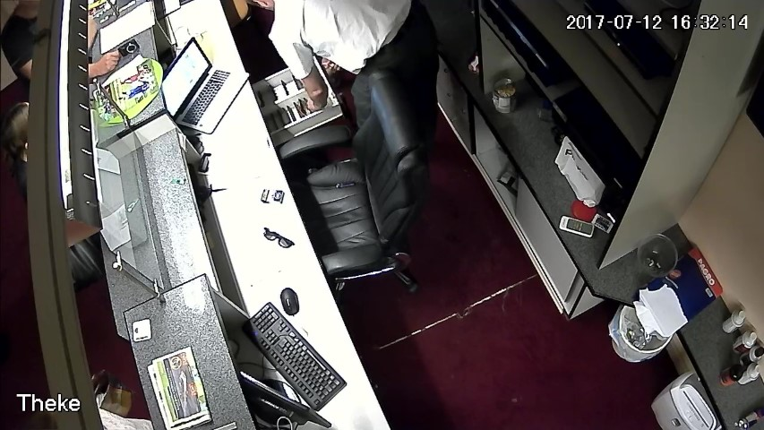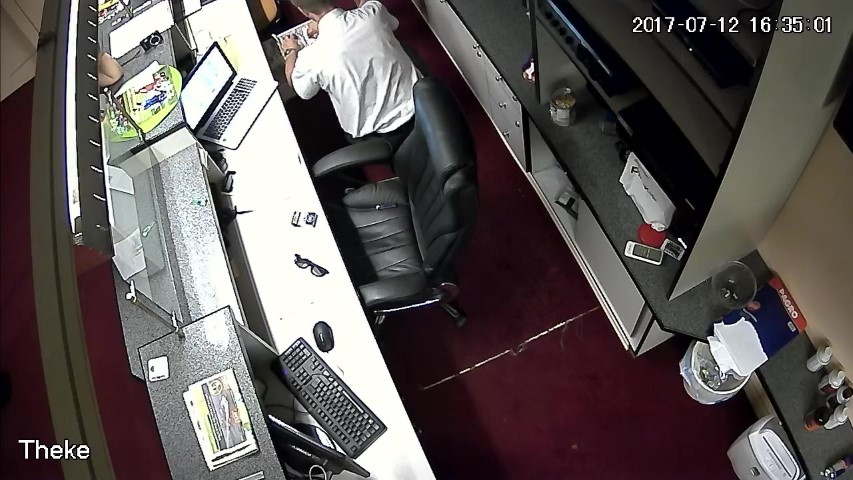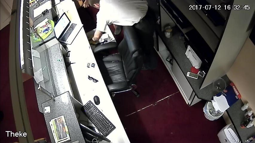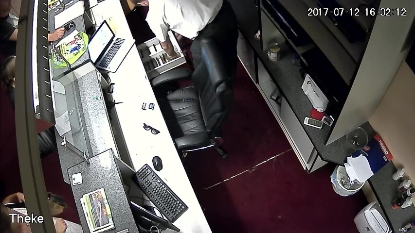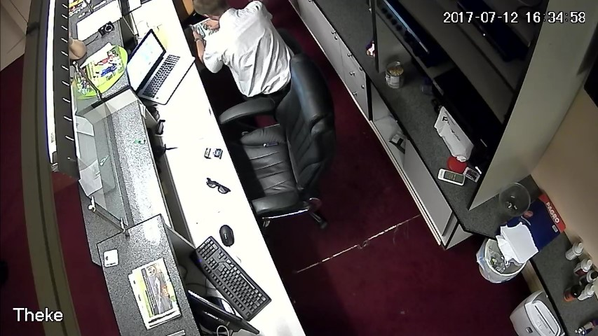 F.14. 16:28:06 bis 09 Uhr: Finanzpolizist greift in die Geldlade.