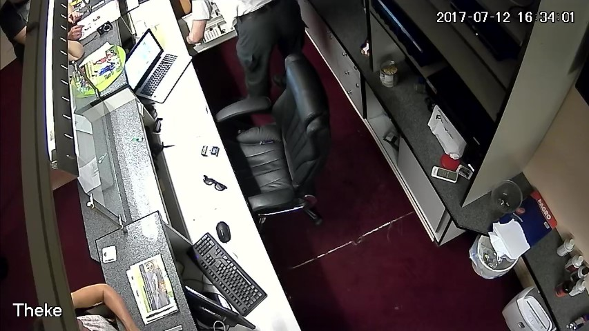 F.23. 16:32:10 bis 12 Uhr: Finanzpolizist durchstöbert Aktenlade unter der Geldlade hinter dem Tresen.