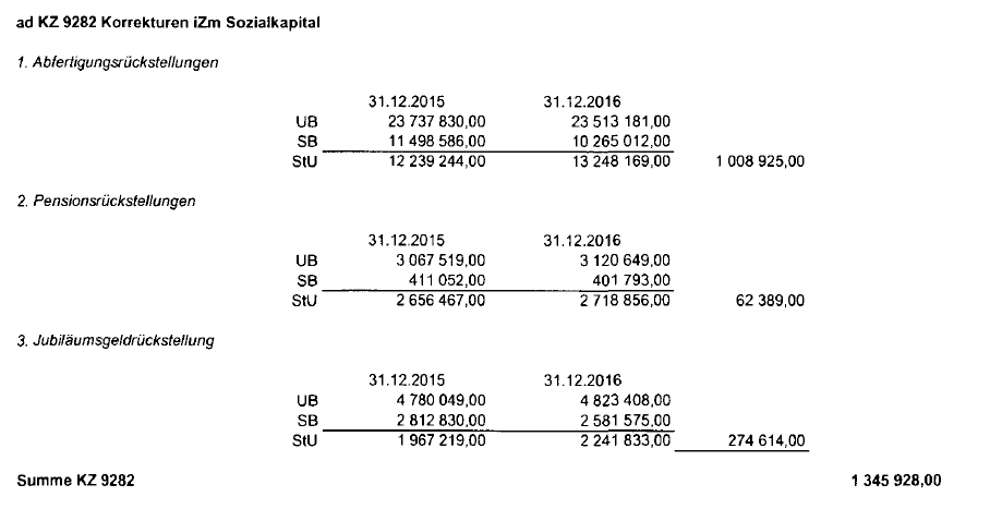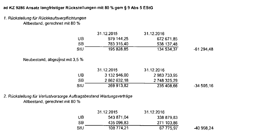 In der Beilage zur Körperschaftsteuererklärung der Beschwerdeführerin betreffend Einkünftefeststellung Gruppenträgerin für das Jahr 2016 sind die folgenden Rückstellungen ausgewiesen: