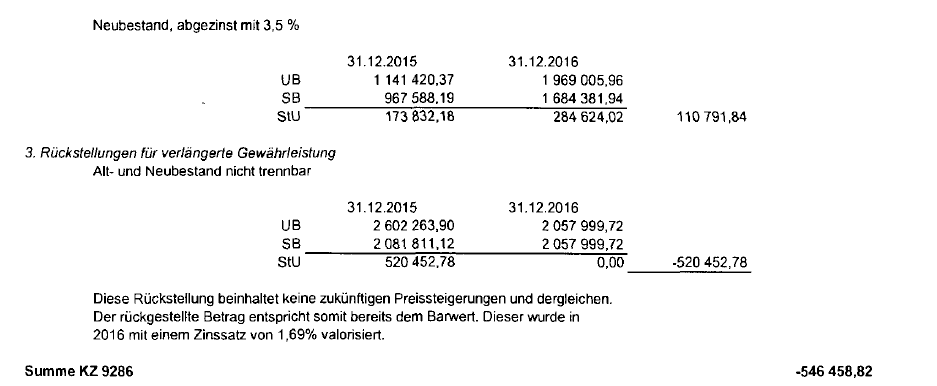 In der Lehre werden die unterschiedlichen Abzinsungssätze von Pensionsrückstellungen und sonstigen langfristigen Rückstellungen ebenfalls kritisiert: "Dass bei Berechnung der Pensionsrückstellungen versicherungsmathematische Methoden anzuwenden sind, dient der Ermittlung der voraussichtlichen Laufzeit, die ja bei einer Pensionszusage auf Lebenszeit nicht feststeht, sowie der Berücksichtigung allfälliger Anwartschaften auf Witwenpensionen. Es ist daher kein sachlicher Grund erkennbar, der unterschiedliche Abzinsungssätze für Pensionsrückstellungen einerseits und sonstige Rückstellungen mit langer Laufzeit rechtfertigen könnte" (Novacek, FJ 2018, 55: Ist die marktkonforme Abzinsung von Rückstellungen verfassungs- und europarechtlich geboten?)