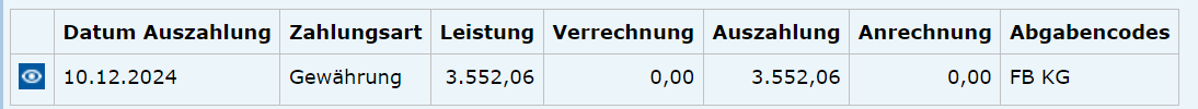 Laut FABIAN wurde an das vom Bf angegebene Konto seiner rechtsfreundlichen Vertretung am 10.12.2024 ein Betrag von € 3.552,06 (mit näherer Aufschlüsselung) überwiesen: