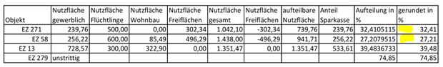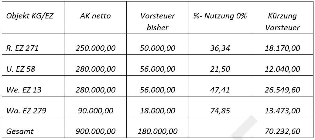 Somit kann der Erwerber aus dem Ankauf der Liegenschaften den Vorsteuerabzug nur in eingeschränktem Ausmaß in Anspruch nehmen. Das sind It. Bp. (Aufteilung in Nutzflächen It. Hausabrechnung bzw. Hausverwaltung):
