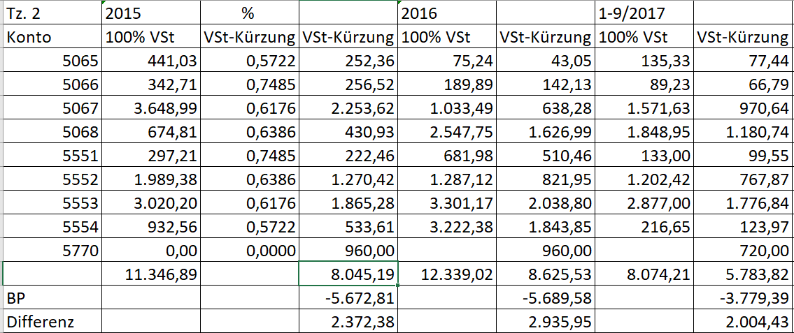 Die Kürzung der Vorsteuern sind natürlich korrekt. Lediglich beim %-Satz der vorgenommenen Kürzung komme ich auf Grund der mir vorliegenden Berechnung nicht auf die Werte seitens der Bp.