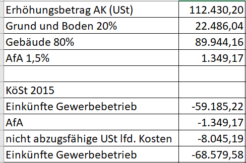 Als Konsequenz aus dem nicht anzuerkennenden Vorsteuerabzug von € 70.232,60 erhöhte die Außenprüfung die Anschaffungskosten der "Sp.-Häuser" um diesen Betrag. In weiterer Folge wurde unter Ausscheidung des Anteils für Grund und Boden ein zusätzlicher Afa-Betrag ermittelt und gewinnmindernd in Ansatz gebracht.