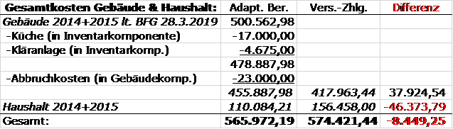 Auf die zusätzliche Anfrage, wie sich bzgl. der Gebäudekomponente der Differenzbetrag iHv 14.963,98 Euro zur Summe lt. E-Mail vom 05. März 2014 (395.999,46 Euro) erklären lasse und wie hoch die geleisteten Zahlungen jahres- und gegenstandsbezogen gewesen seien, wurde von der Y.Y. AG wie folgt rückgemeldet: