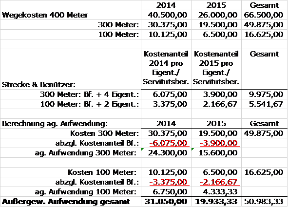 Bei der Berechnung des zu tragenden Kostenanteil wird vom Bundesfinanzgericht eine prozentuell gleichmäßige Aufteilung für die beiden Teilstrecken (für 300 Meter eine Aufteilung zw. der Bf. und den vier Grundeigentümern, für 100 Meter eine Aufteilung zw. der Bf. und zwei Grundeigentümern) als sachgerecht angesehen, da zwar bei den Dienstbarkeitsberechtigten von einer höhere Frequenz des Weges als von den Grundeigentümern auszugehen ist, die Belastung der Straße durch