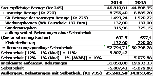 Unter Ansatz der anzuerkennenden Aufwendungen ergibt sich folgende Berechnung der außergewöhnlichen Belastungen mit Selbstbehalt für die Jahre 2014 und 2015 (Kz 735):